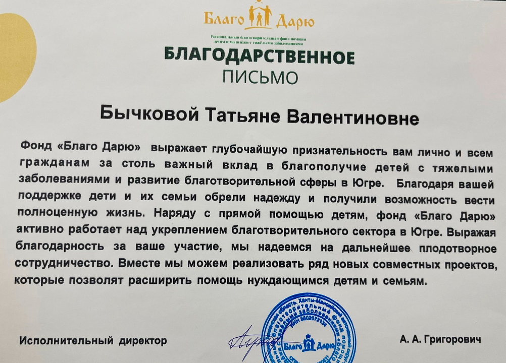Генеральный директор АО «Газпром энергосбыт Тюмень» Татьяна Валентиновна Бычкова входит в попечительские советы благотворительных фондов «Траектория Надежды» и «Благо дарю».