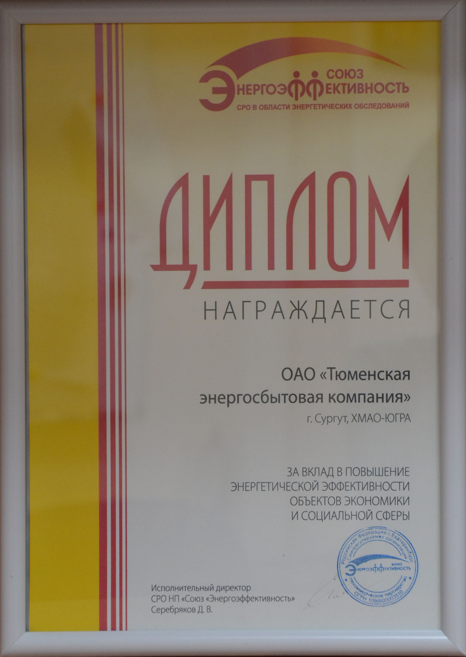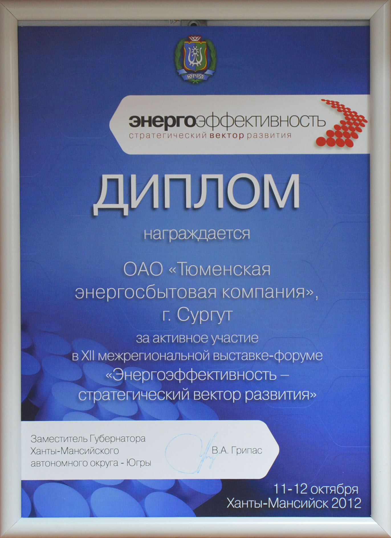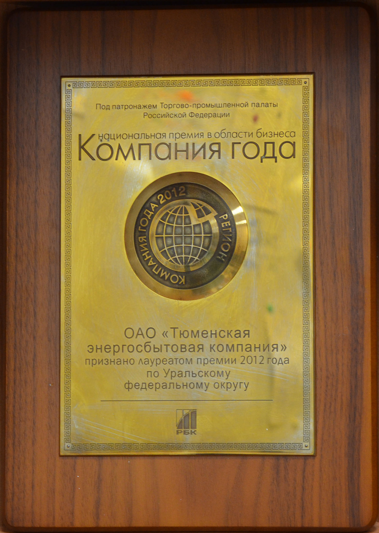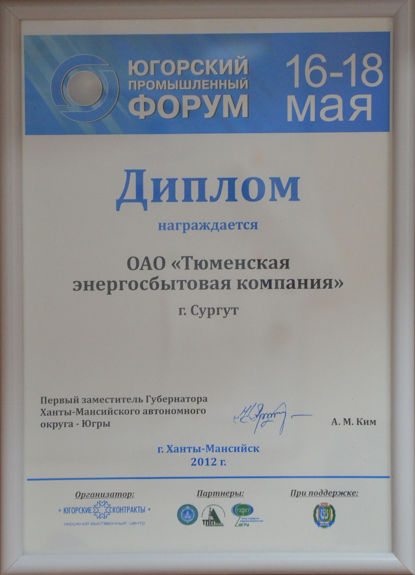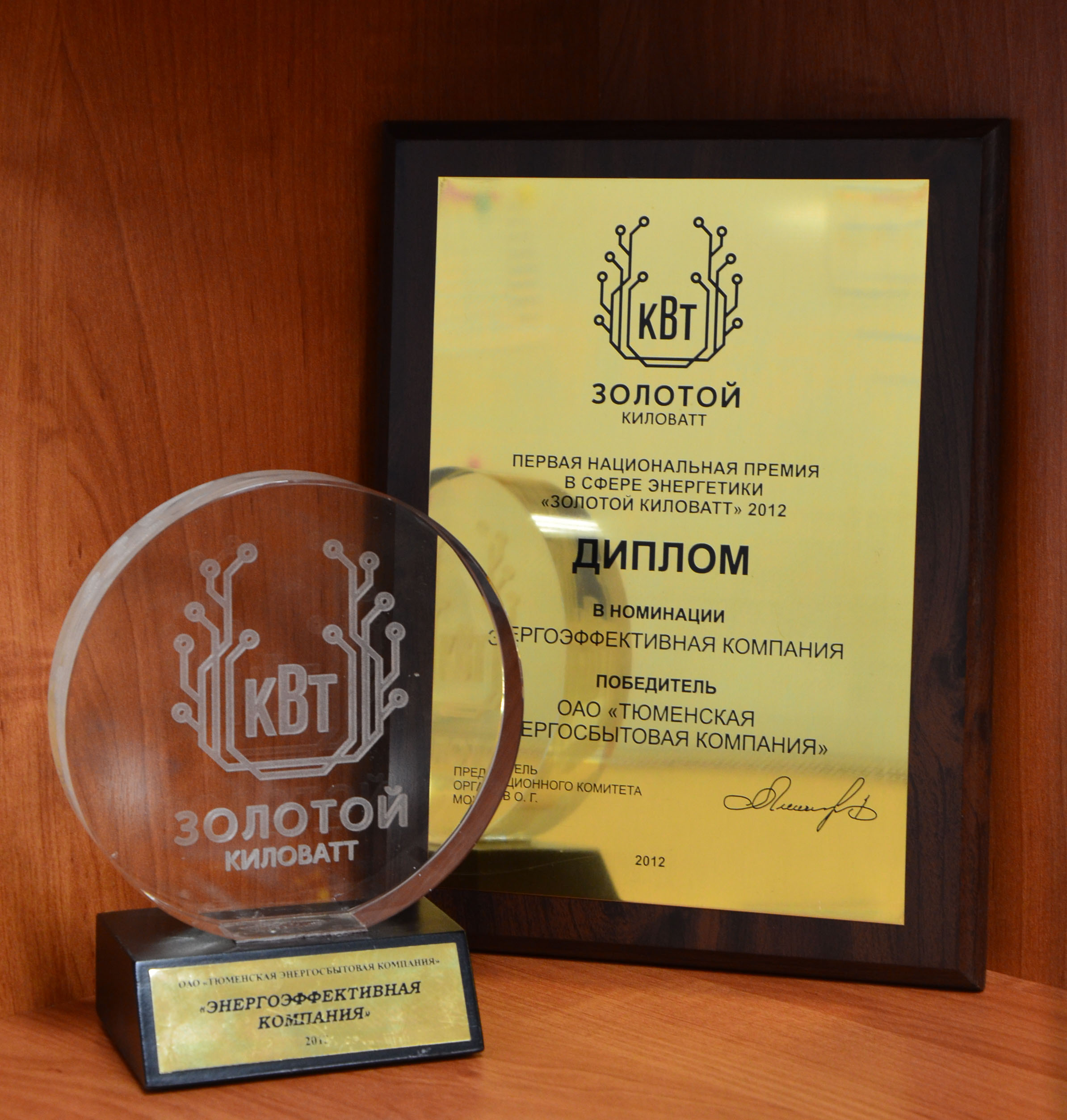 Диплом победителя в номинации "Энергоэффективная компания" Первой национальной премии в сфере энергетики "Золотой киловатт - 2012", г. ЕкатеринбругДиплом I степени в номинации "Внедрение инновационных технологий" межрегиональной специализированной выставки "Строительство, энергетика, экология, ЖКХ. Инновационные технологии - крайнему Северу", г.Новый УренгойДиплом за активное участие в XII межрегиональной выставке - форуме "Энергоэффективность - стратегический вектор развития", г.Ханты-МансийскДиплом СРО НП "Союз "Энергоэффективность" за вклад в повышение энергетической эффективности объектов экономики и социальной сферы, г.ЕкатеринбургНаграда лауреата по Уральскому федеральному округу национальной премии в области бизнеса "Компания года - 2012", г. Екатеринбург
