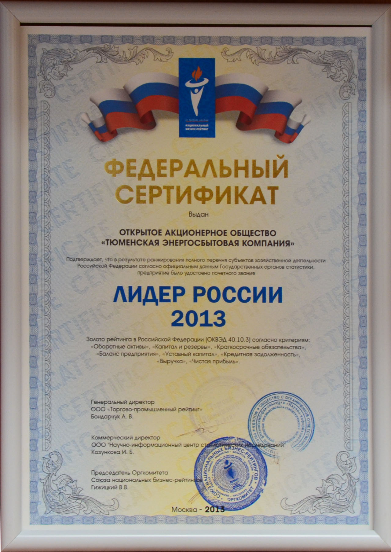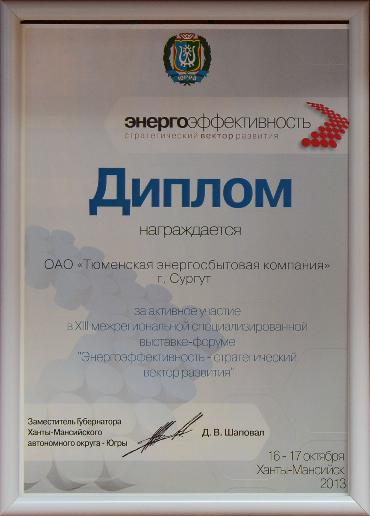 Награда за 2 место в номинации «За участие в решении социальных проблем территорий и развитие корпоративной благотворительности» регионального этапа всероссийского конкурса «Российская организация высокой социальной эффективности», г. Ханты-МансийскДиплом в номинации «Энерго- и ресурсосбережение» конкурса «Полярная сова» IX межрегиональной специализированной выставки «Строительство. Энергетика. Экология. ЖКХ — Крайнему Северу», г.Новый УренгойДиплом за активное участие в XIII межрегиональной специализированной выставке-форуме «Энергоэффективность — стратегический вектор развития-2013», г.Ханты-МансийскПамятный знак «Лидер оптового рынка электроэнергии среди гарантирующих поставщиков» опроса «Профессиональное признание» в рамках работы VIII профессионального Форума энерготрейдеров России, г. Москва
