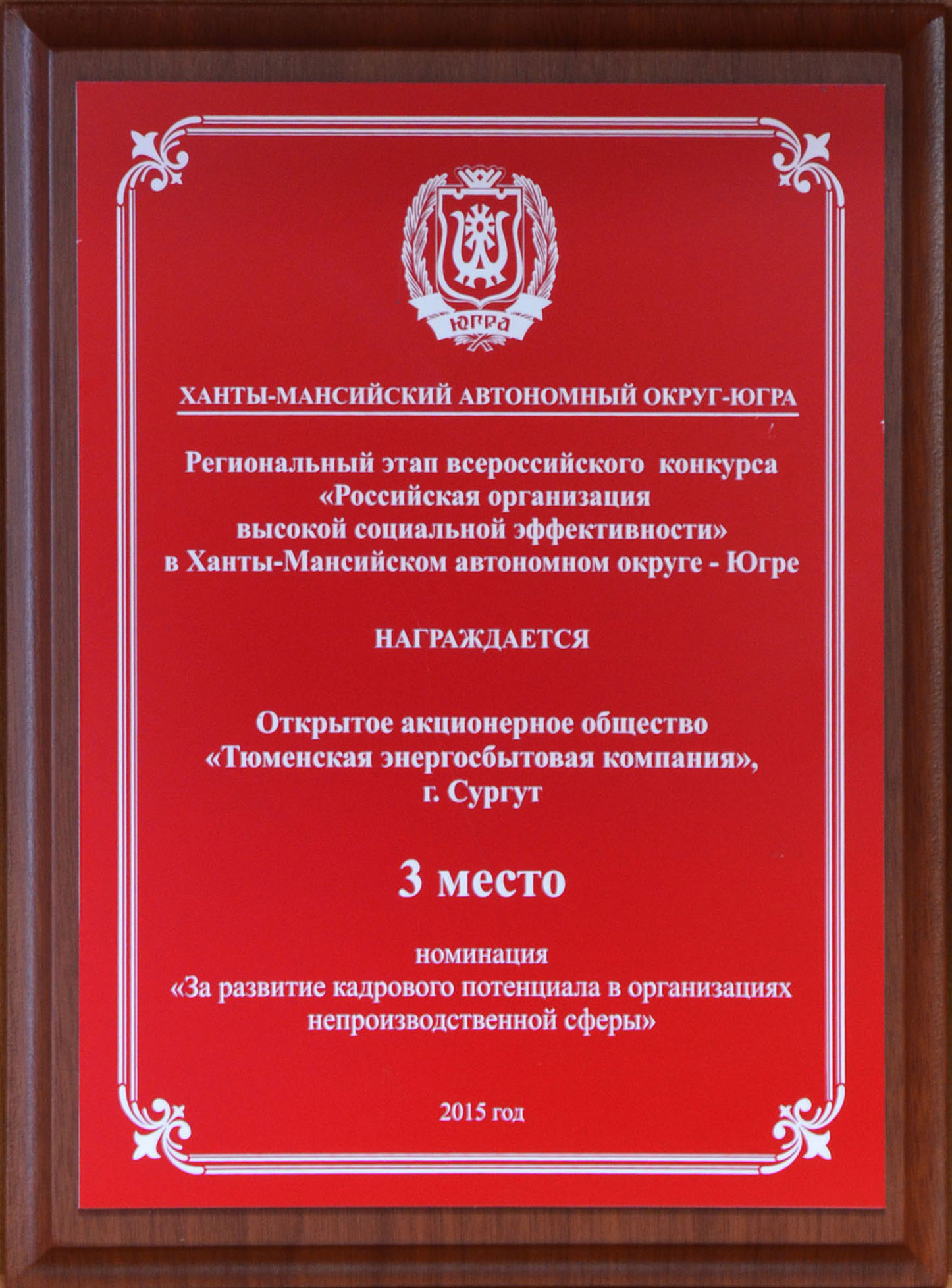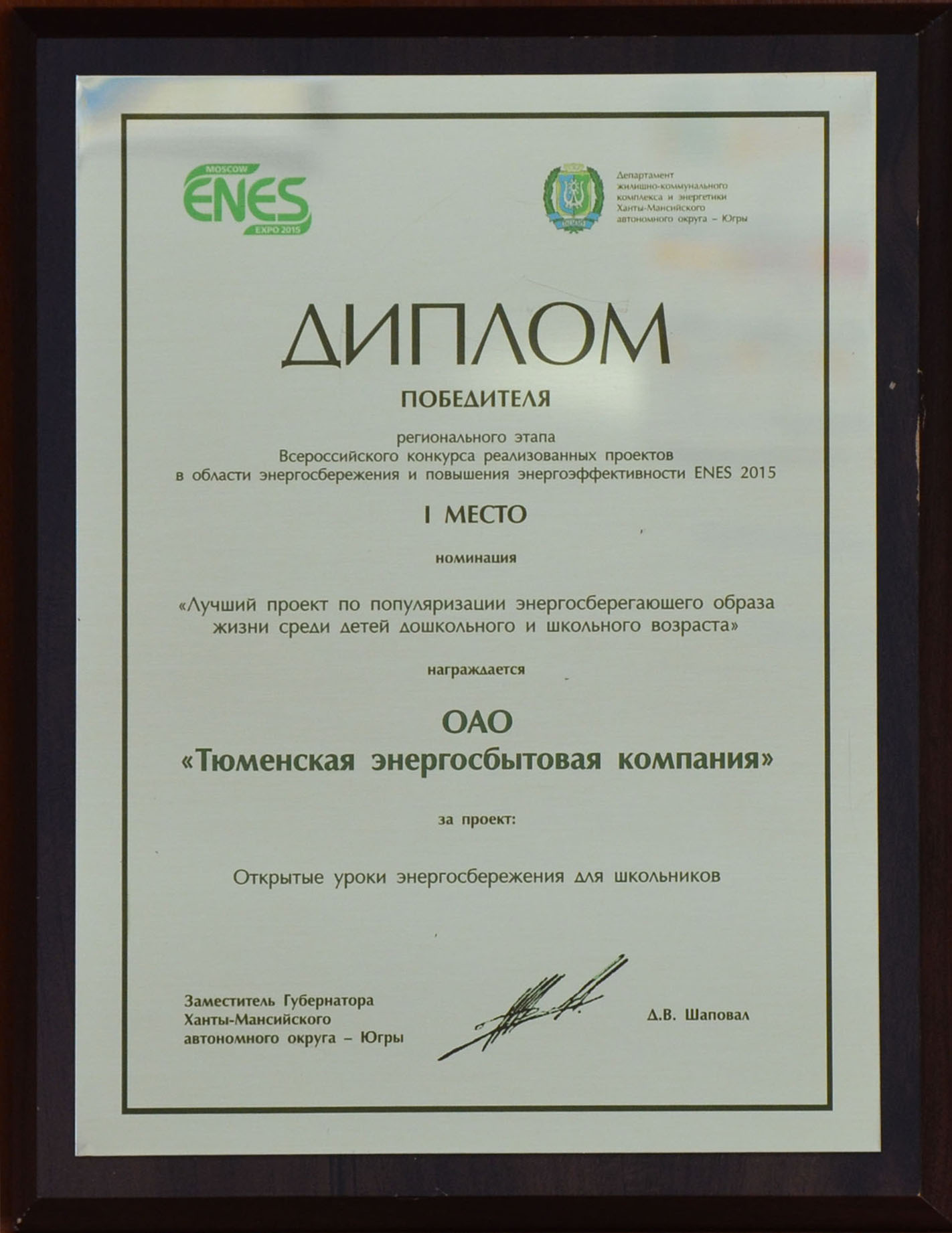 Диплом победителя регионального этапа Всероссийского конкурса реализованных проектов в области энергосбережения и повышения энергоэффективности "ENES-2015" в номинации "Эффективная модель привлечения внебюджетных средств в коммунальном хозяйстве"Диплом за 1 место в номинации «За участие в решении социальных проблем территорий и развитие корпоративной благотворительности» регионального этапа всероссийского конкурса «Российская организация высокой социальной эффективности»Диплом за 3 место в номинации «За развитие кадрового потенциала в организациях непроизводственной сферы» регионального этапа всероссийского конкурса «Российская организация высокой социальной эффективности»Диплом победителя регионального этапа Всероссийского конкурса реализованных проектов в области энергосбережения и повышения энергоэффективности "ENES-2015" в номинации "Самый информативный и посещаемый демонстрационный центр энергоэффективности"Диплом победителя регионального этапа Всероссийского конкурса реализованных проектов в области энергосбережения и повышения энергоэффективности "ENES-2015"Диплом победителя регионального этапа Всероссийского конкурса "МедиаТЭК" в номинации "Профессиональный PR в регионе" за проект "ОДН - платим без проблем!"Награда за 1 место V Всероссийского конкурса "Лучшая энергосбытовая компания России" в номинации "Максимально клиентоориентированная энергосбытовая компания"