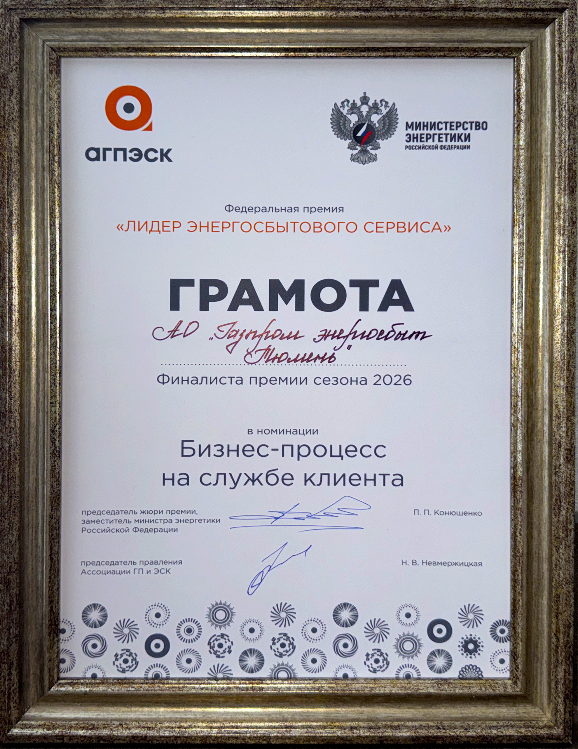 Грамота финалиста первой федеральной премии «Лидер энергосбытового сервиса»