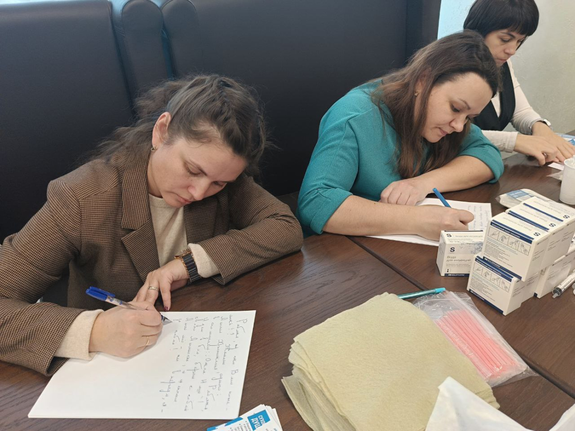 В этот раз собственноручно делали наборы «сухого» армейского душа. В основе «сухого» душа – дорнит, материал имеет мягкие абразивные свойства, что позволяет эффективно очищать кожу. Полотно предварительно нарезают на небольшие квадраты, каждый отрезок пропитывают средством для ухода за лежачими больными. Раствор обладает бактерицидными свойствами, не требует смывания и не сушит кожу.